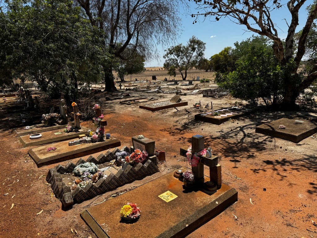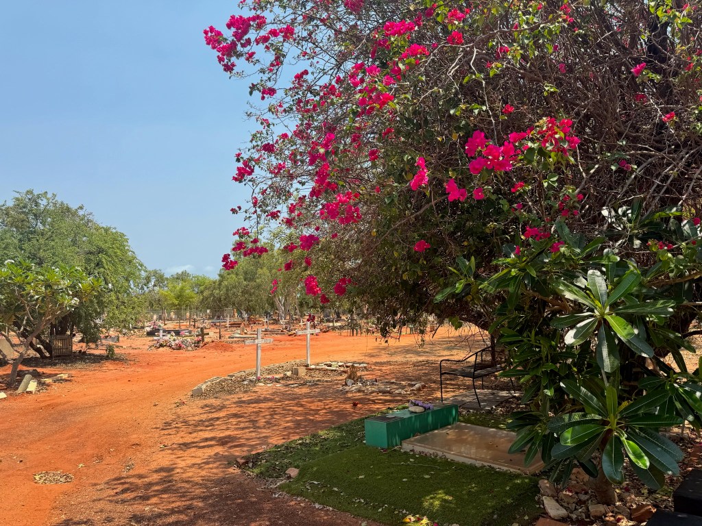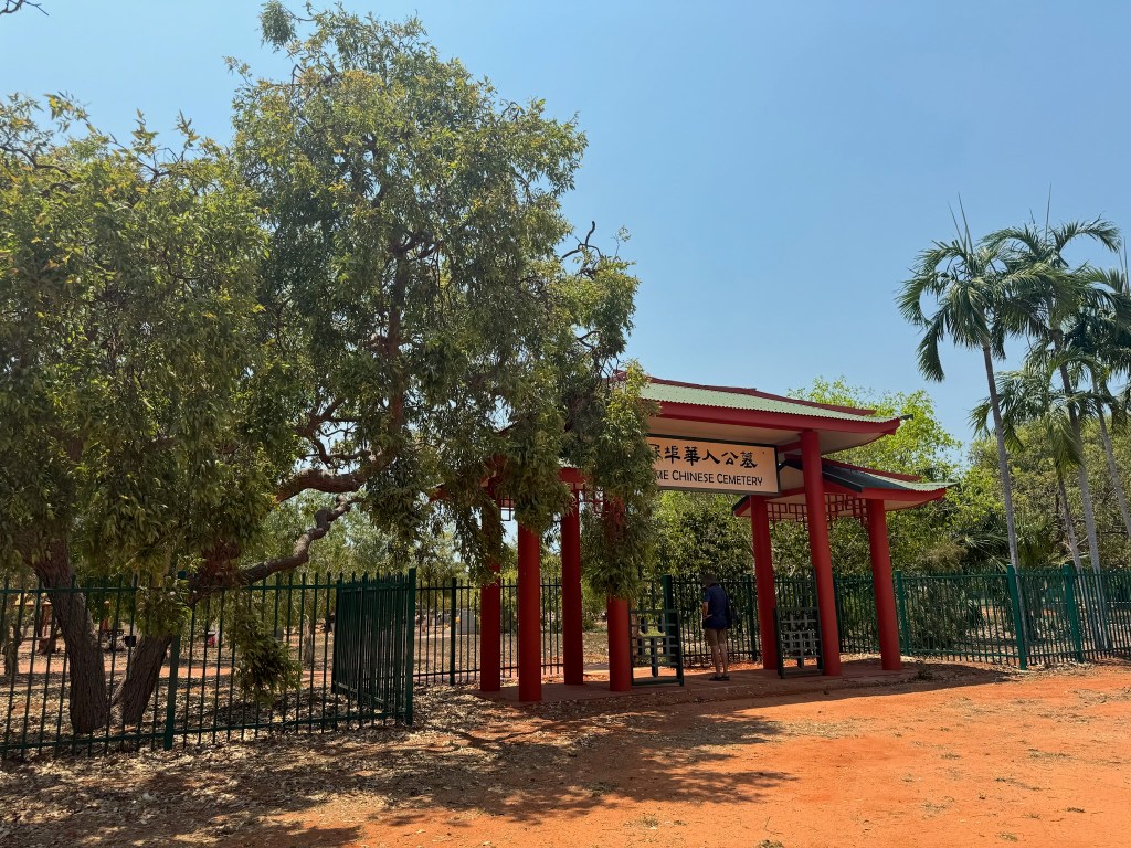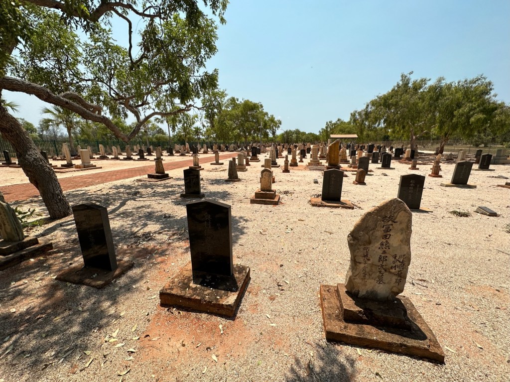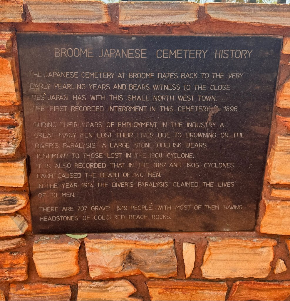 Am Sonntag sind wir zum Friedhof gelaufen, ca. 1,5 km, wieder in australischer Hitze. Der Friedhof war wirklich ein Besuch wert. Einerseits wegen der vielen Gräber der Perlentaucher aus dem letzten Jahrhundert, anderseits war der riesige Friedhof in Sektoren eingeteilt: Da gabs einen Teil für die Katholiken, einen für die Muslime, einen japanischen, einen chinesischen, einen malayischen Teil und auch die Aborigines hatten ihren Bereich. In jedem Friedhofteil sah es anders aus. Im japanischen Bereich alle Gräber wie mit dem Lineal ausgerichtet, der Boden gekiest, kein Unkraut. In andern Bereichen standen die Gräber ziemlich willkürlich in der Gegend herum. Auffallend: Bei vielen Gräbern standen Stühle oder Sitzbänke, manchmal gar ein Sofa für die Angehörigen.