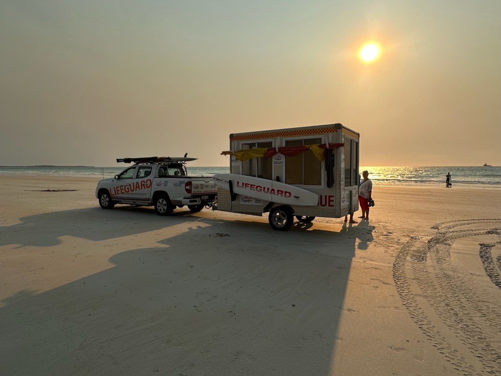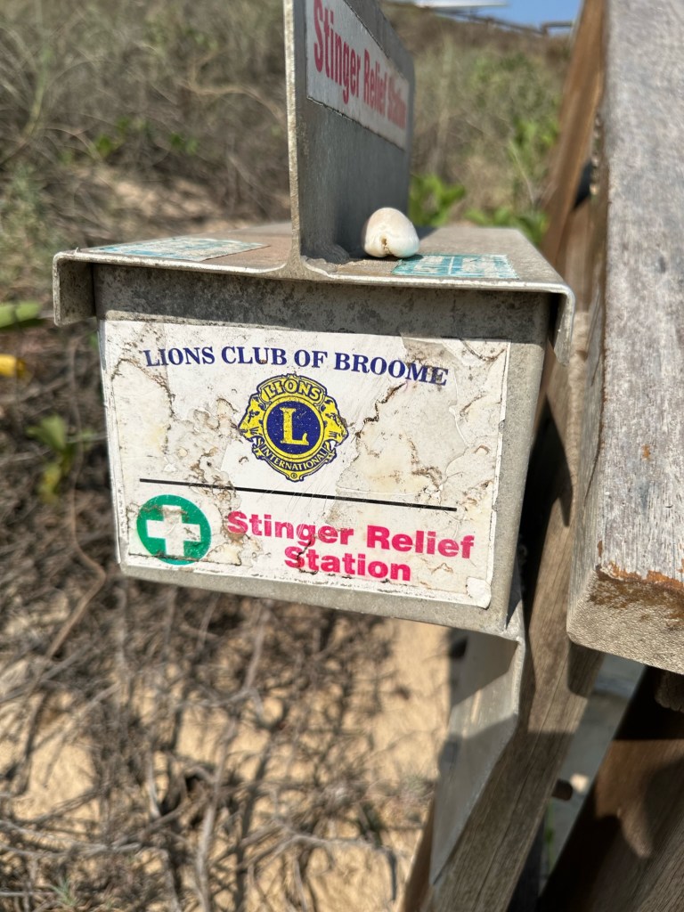 Am Montag sind wir erneut zum Cable Beach. Schönstes und heisses Wetter liess uns keine Wahl: Trotz Warnung vor Salzwasserkrokodilen, Quallen und Strömungen wagten wir es ins Wasser, zumal eine Abschätzung der Wahrscheinlichkeit einer unliebsamen Begegnung klein schien. Schliesslich weilte etwa ein Dutzend Personen im Wasser und ein kleines Stück Strand war überwacht und für den Fall, dass man mit einer Qualle in Berührung kam, stand Essig bereit.