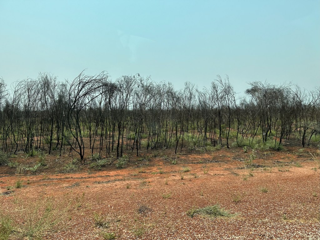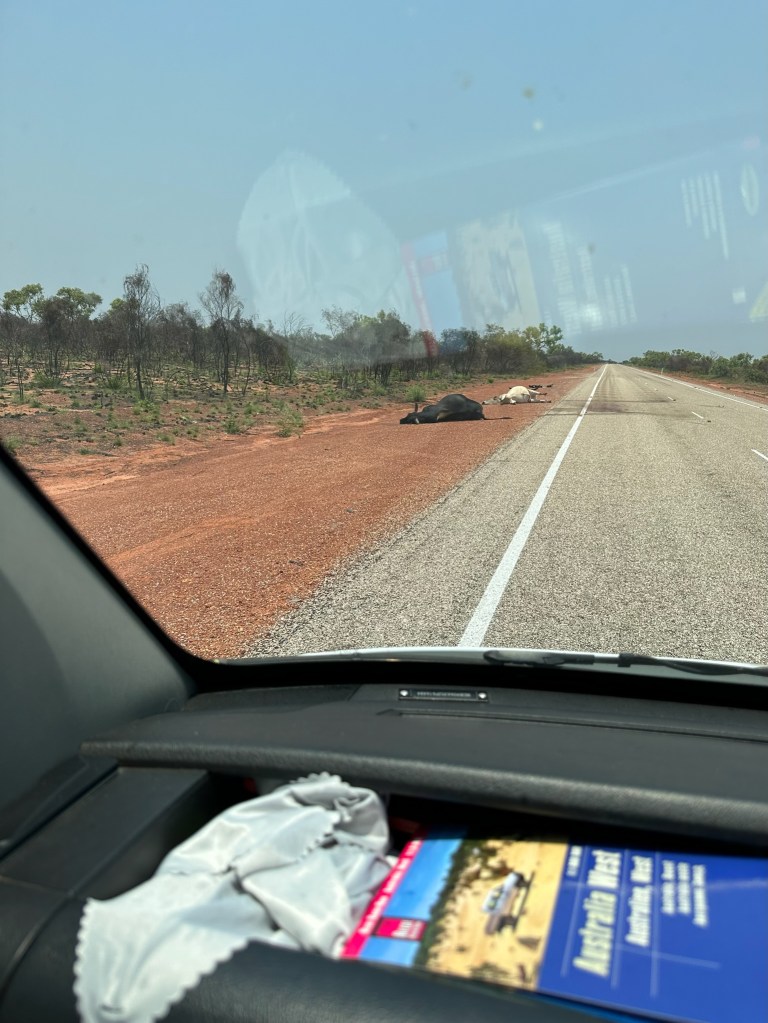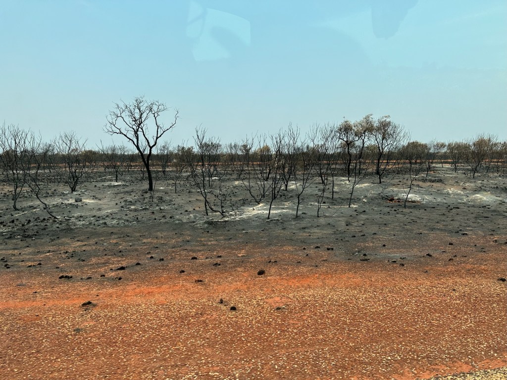 Heute fuhren wir knapp 400 km über den Great Northern Highway (klicken) Richtung Süden bis zum Eighty Miles Beach. Unterwegs sind wir durch jene Gebiete gefahren, in denen Buschbrände gewütet haben. Drei Mal haben wir einen Roadtrain – LKW mit drei Anhängern – gekreuzt. Diese sind so schwer, dass sie bei einem überraschend auftauchenden Hindernis weder ausweichen noch bremsen können. So haben wir am Strassenrand fünf tote Rinder und mehrere tote Wallabies gezählt.
