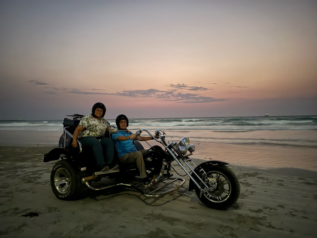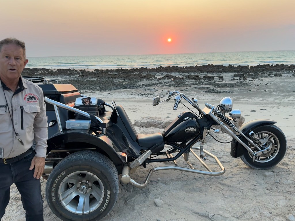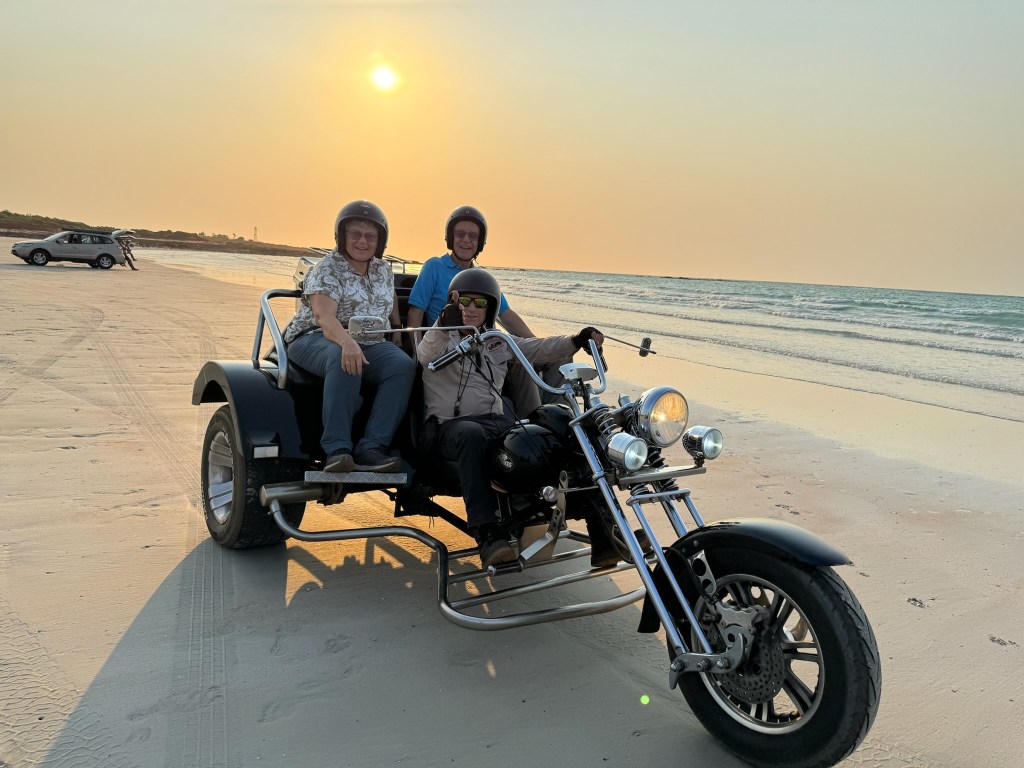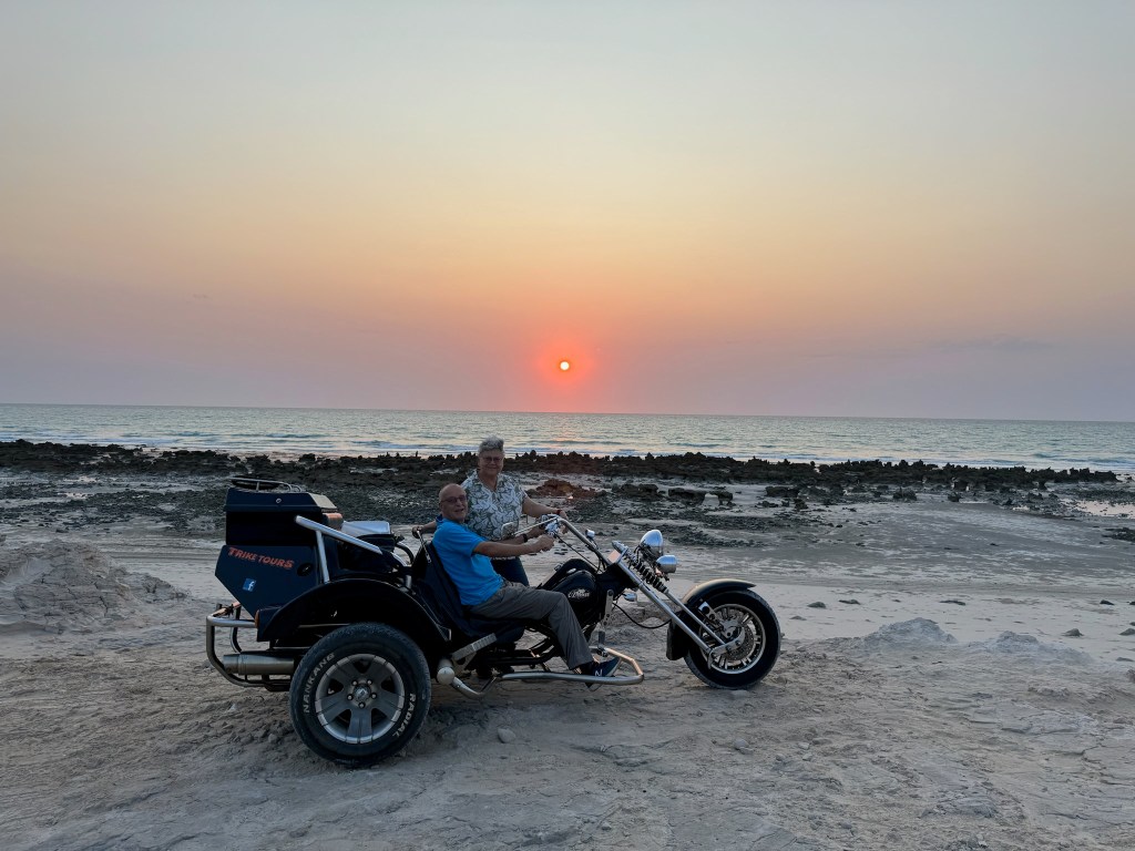 Am Mittwoch dann der Ausflug mit einem Trike. Der Fahrer, Roger, hatte viel zu erzählen und wir lernten Einiges über die Natur rund um Broome. Gegen Schluss kamen wir in den Genuss eines wunderbaren Sonnenuntergangs an einem abgelegenen Strand, verbunden mit der Degustation einiger lokaler Spezialitäten und einiger Schnäpse. Die Fahrt mit dem Trike, teilweise auf Schnellstrassen, teilweise über sandige Wege hat uns ausgezeichnet gefallen. Wäre ich jünger, würde ich mir vielleicht so ein Gefährt zulegen.