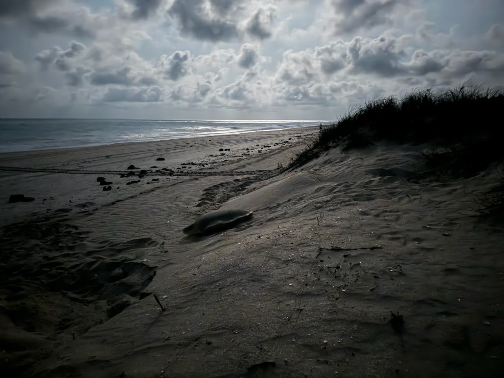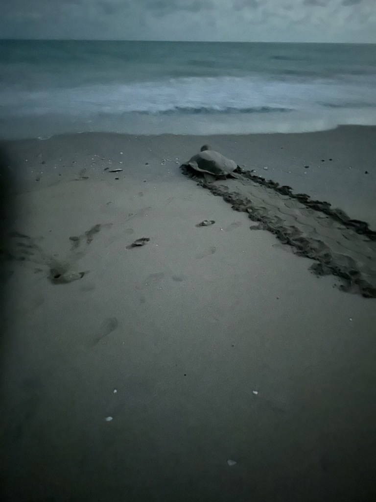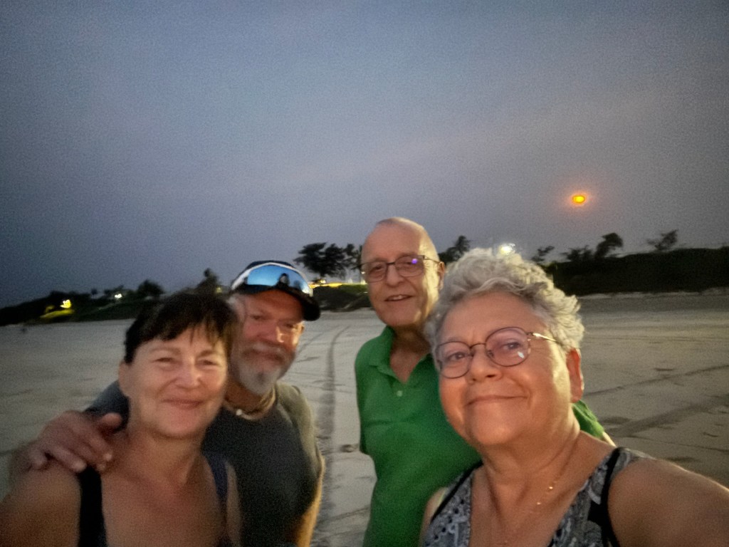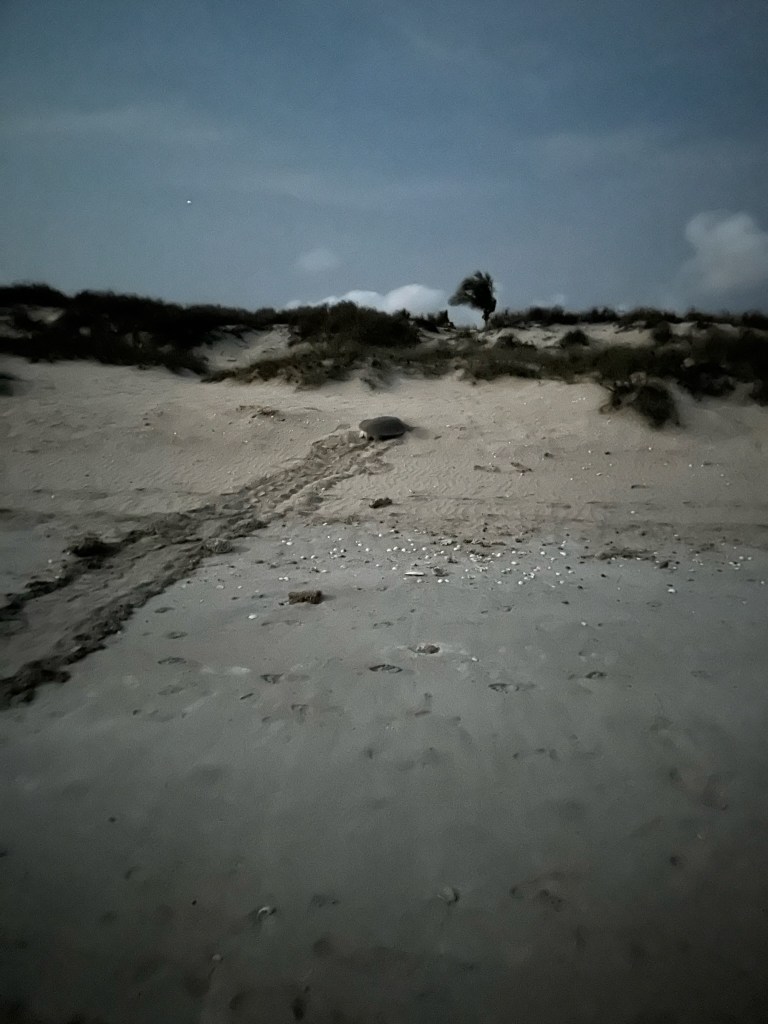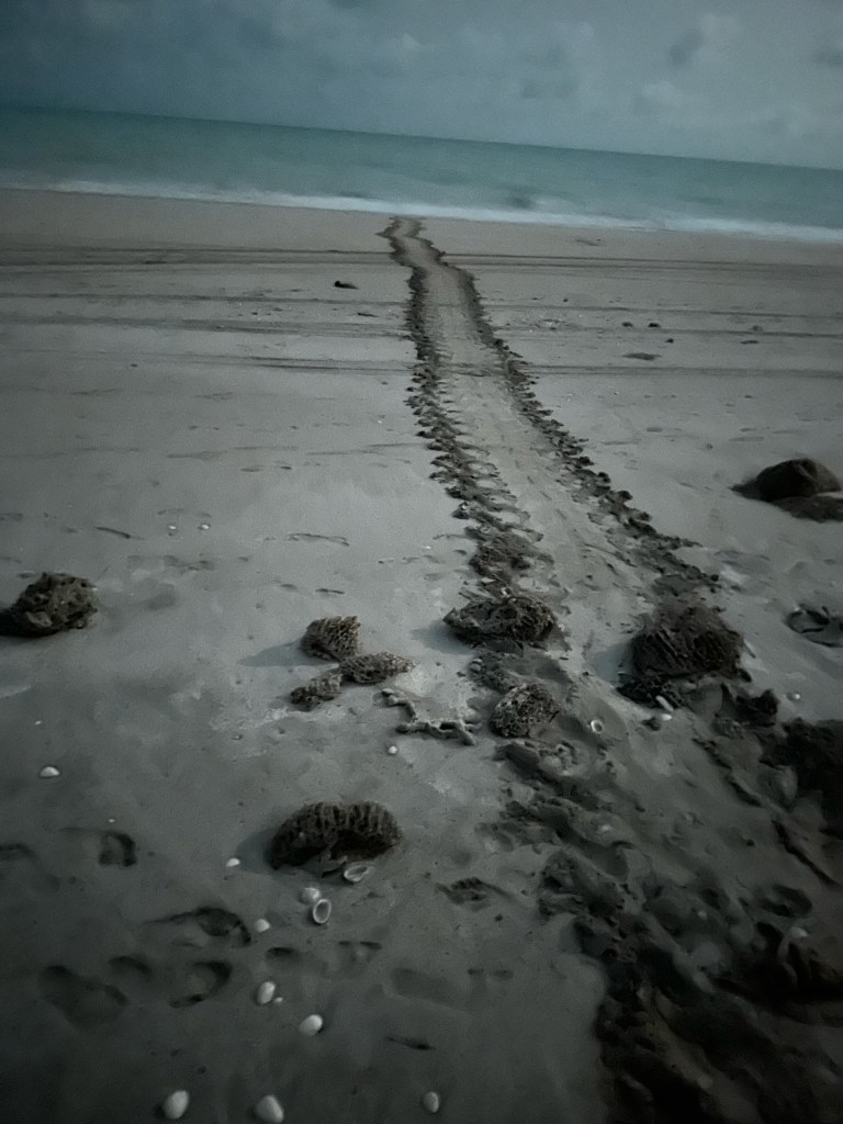 Die letzten 9 km fuhren wir über eine Sand- & Kiesstrasse. Unser Auto hat diese Fahrt nicht sehr genossen, jedenfalls leuchtete plötzlich ein Warntext auf: ABS – Visit Workshop! Morgen müssen wir über die gleiche Holperpiste zurück. Ich hoffe, dass sich das Ding morgen auf der Hauptstrasse wieder beruhigt und mir kein schlechtes Gewissen mehr macht. Am Eighty Miles Beach konnten wir leider nicht baden – zu viele gefährliche Quallen. Dafür sind wir mit Sabine und Richard, die wir hier wieder getroffen haben, nachts zum Strand in der Hoffnung Flatback Turtles zu sehen. Diesmal hatten wir mehr Glück als gestern mit dem Stairway to the Moon: Wir konnten zwei Flachrücken Seeschildkröten sehen, wie sie sich den Strand hoch kämpften und oberhalb der Flutlinie im weichen Sand eine Vertiefung aushoben, in welche sie 50-70 Eier gelegt und zugedeckt haben. Anschliessend machten sie sich auf den beschwerlichen Weg zurück ins Meer. Uns Vier hat das seltene Naturereignis tief beeindruckt.