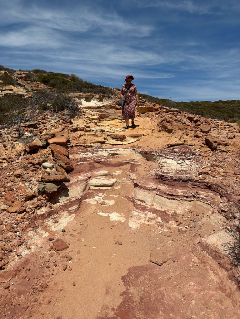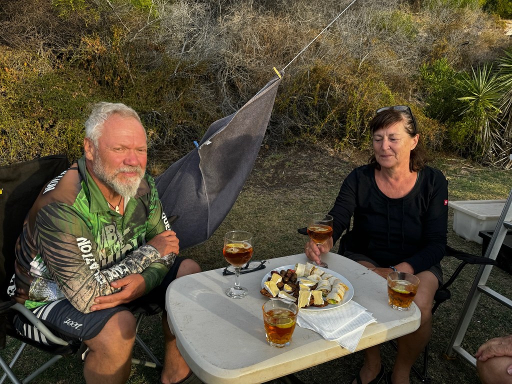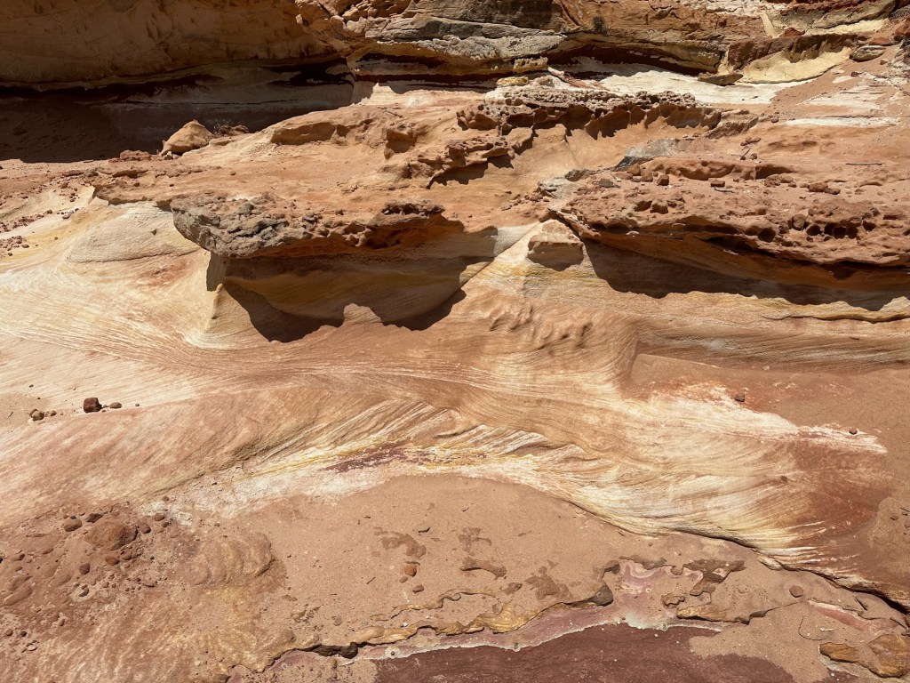 Vom Roadhouse sind wir via Kalbarri rund 300 km nach Port Gregory gefahren. In Kalbarri haben wir eine kurze Mittagsrast gemacht und Brot gekauft. Kurz nach Kalbarri sah ich ein Schild „Rainbow Valley“ und bog kurz entschlossen ab. Nach wenigen Metern kam ein kleiner Parkplatz und von dort aus hiess es wandern. Ich habe Carole zu dieser Wanderung genötigt und wir beide haben es nicht bereut, wurden wir doch mit vielen schönen landschaftlichen Bildern belohnt. Vor Port Gregory liegt der Pink Lake, bei welchem wir einen weiteren Halt machten (die beiden Bilder habe ich aus dem Internet kopiert). Und man glaubt es kaum: Zufällig trafen wir auf dem Zeltplatz in Port Gregory unsere Freunde aus Bayern, Sabine und Richard, wieder. Wir haben die Gelegenheit genutzt und gemeinsam gekocht (ich natürlich nicht, sonst hätte es Magenverstimmungen gegeben): Nach Apérohäppchen mit Pimms gabs Spaghetti, Süsskartoffeln, Blumenkohl und Porterhouse Steak. Dazu Wein und am Schluss ein Schnäpschen.