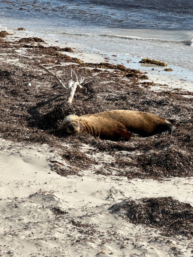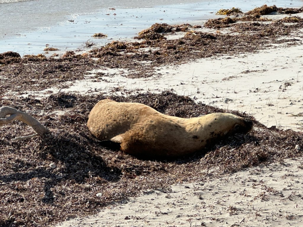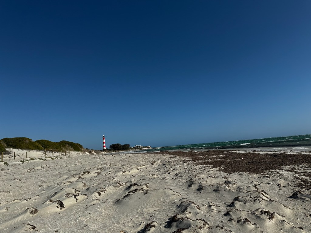 Wir entschlossen uns, zwei Tage in Geraldton zu bleiben. Am Nachmittag spazierten wir dem Strand entlang zum Leuchtturm. Der Wind hat so stark geblasen, dass wir kaum vorwärts kamen. Die Hutkrempe haben wir wegen des uns entgegen geblasenen Sandes tief über die Augen gezogen und daher nur wenige Meter nach vorn gesehen. Plötzlich nahm ich vor mir eine Bewegung wahr. Wie wir genauer hinschauten, merkten wir, dass wir etwa 10 Meter vor einer Fellrobbe, welche sich gerade zum Ausruhen am Strand niederliess, standen!