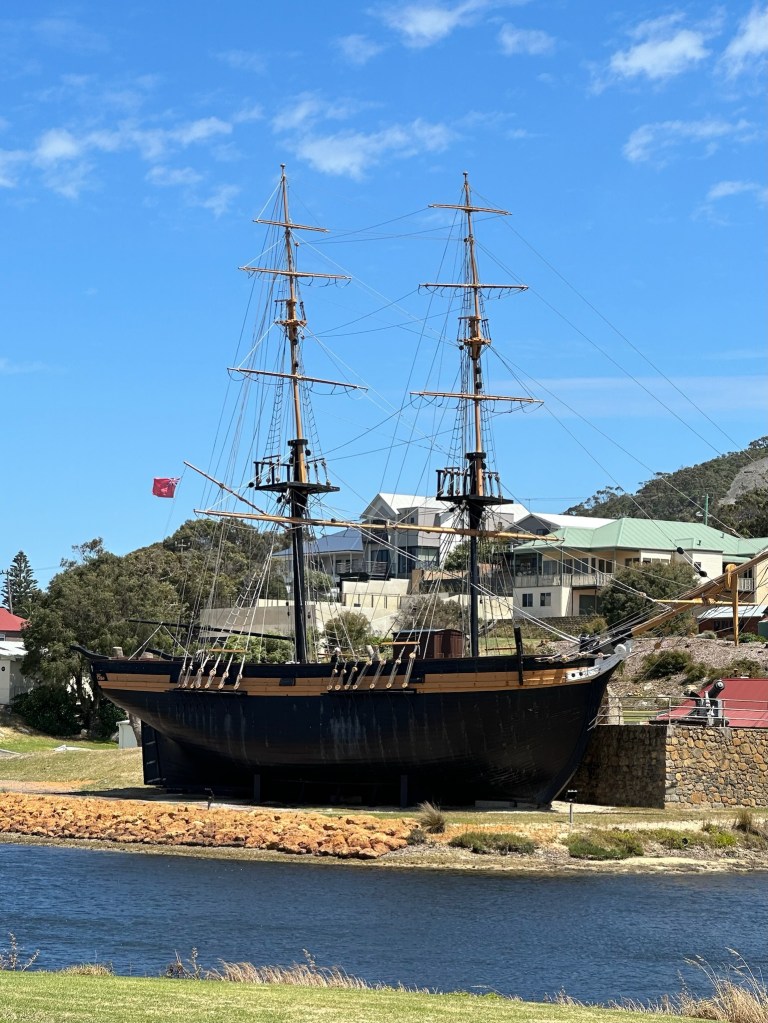 Museumstag in Albany: Zuerst haben wir den Nachbau der Brig Amity besucht. Dieser Zweimaster hat 1826 die ersten weissen Siedler nach dem heutigen Albany gebracht. Wir können uns heute kaum vorstellen, wie entbehrungsreich die Schifffahrt und die ersten Jahre der Siedler waren! Danach haben wir das alte Gefängnis besucht und einige haarsträubende Geschichten über die damaligen Insassinnen und Insassen gelesen. Ebenso, wie harsch damalige Strafen für kleine Vergehen ausfielen. Nach dem (kurzen) Besuch eines weiteren geschichtlichen Museums haben wir den Tag mit einer Fahrt zum Convoy Lookout – von hier aus sah man 1914 den Convoy mit zehntausenden Soldaten und tausenden Pferden Richtung Europa losfahren – und an die Küste am Emu Point abgerundet.