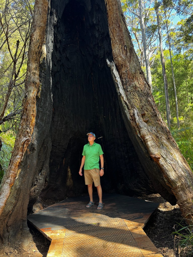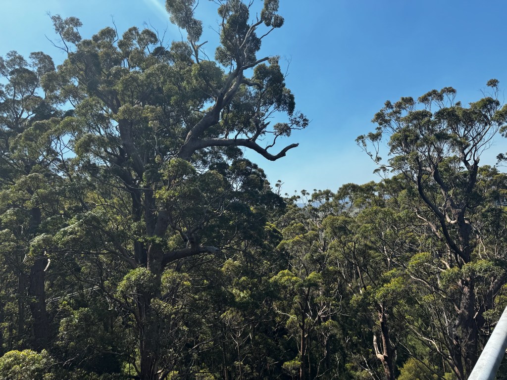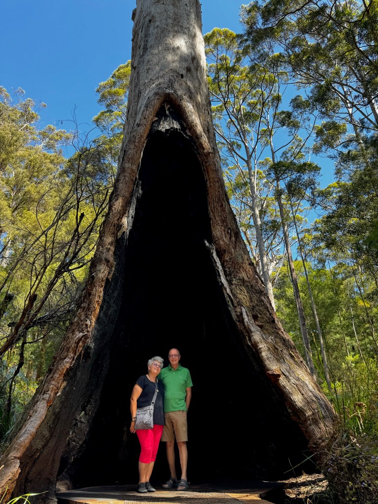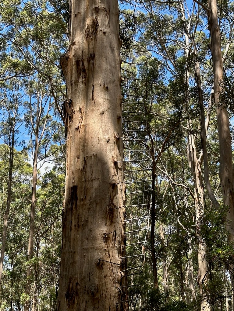 Nach der Rückkehr mit dem Tram sind wir zu Gloucester Tree gefahren. Dies ist ein 72 Meter hoher Karribaum bei dem sich auf 61 Meter Höhe ein Feuerausguck befindet. Auf einer recht abenteuerlichen „Treppe“, gebaut aus ca. zwei Meter langen Schrauben, die in den Baum getrieben wurden, konnte man früher wie auf einer Wendeltreppe nach oben steigen. Schwindelfreiheit und etwas Mut natürlich vorausgesetzt. Mein Mut wurde glücklicherweise nicht auf die Probe gestellt, da die Treppe geschlossen war.