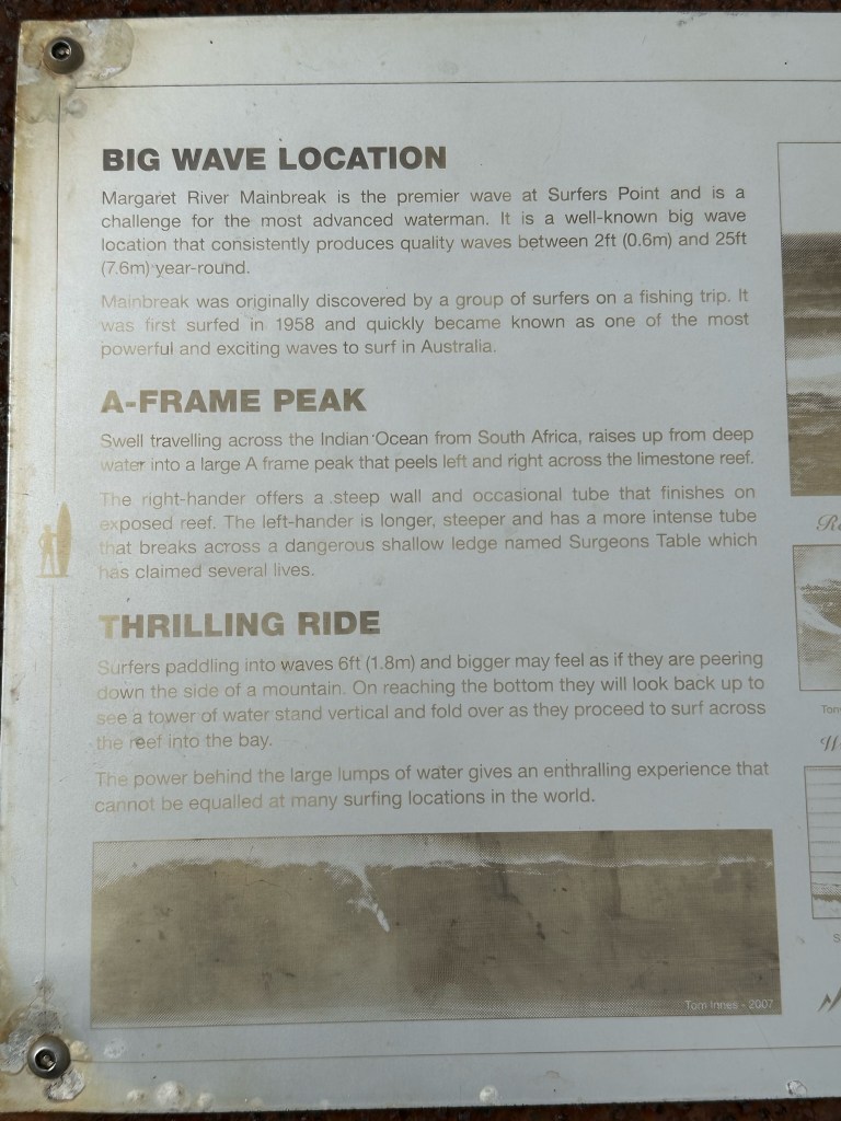 Wir haben uns entschlossen, Margaret River näher kennen zu lernen. Nach gemütlichem Vormittag sind wir ans Meer zur Mündung des Margaret Rivers gefahren. In diesem Küstenstreifen entstehen gewaltige Wellen, welche bei Surfern beliebt sind. In den bis zu über 7 Meter hohen Wellen werden oft Surfwettbewerbe durchgeführt.