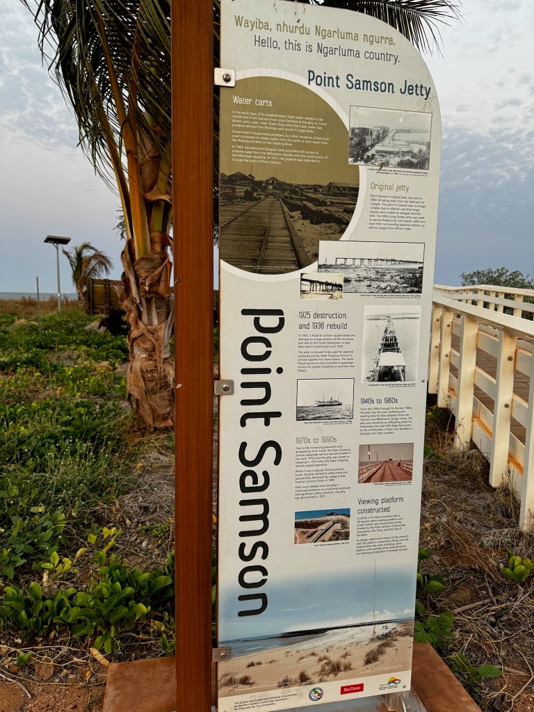 Heute sind wir von Point Samson nach Karratha gefahren – nur rund 60 km. Nachdem wir gestern um 17.15 Uhr vor einem bereits geschlossenen Camping standen und wir so quasi eingebrochen sind (natürlich haben wir heute Vormittag als erstes den Eintritt bezahlt), haben wir uns diesmal schon Stunden im Voraus auf dem Camping von Karratha (klicken) angemeldet. Bevor wir in Karratha auf den Campingplatz sind, haben wir Dampier (von hier aus wird auch Eisenerz und Salz verschifft) besucht und den Zugang zum Murujuga National Park, Burrup Peninsula gesucht, wo wir morgen um 8 Uhr für eine Führung auf einer Aboriginal Site mit Zehntausenden von Felszeichnungen angemeldet sind. Weiteres dann im Blog von morgen.