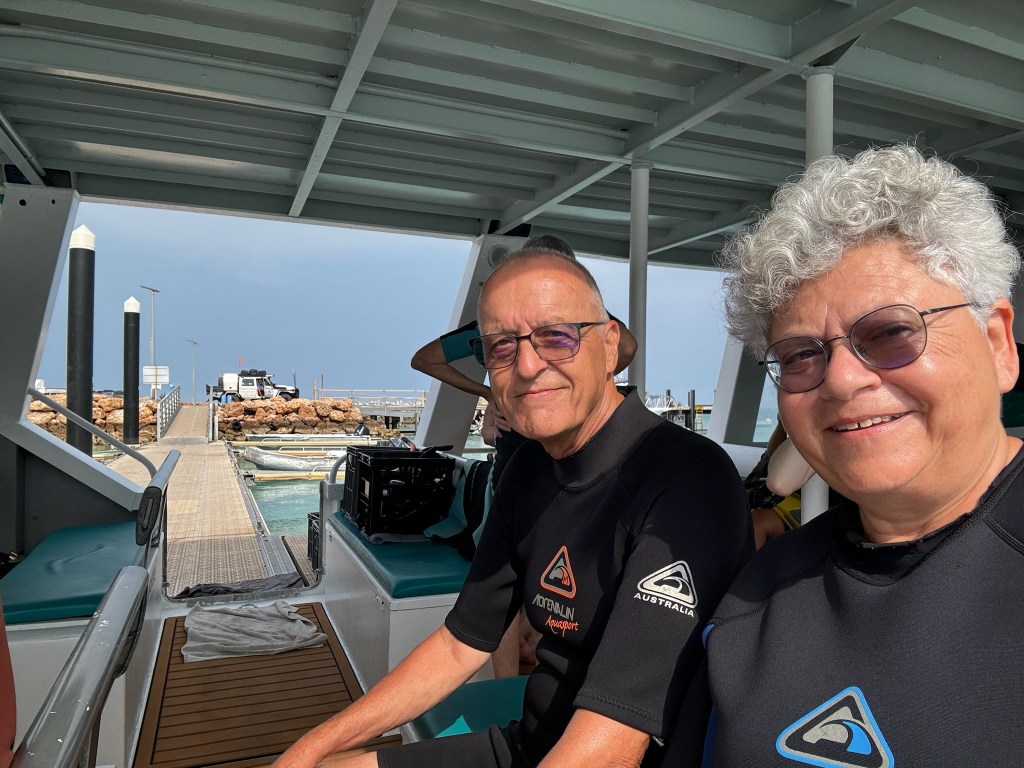 Am Freitagabend haben wir den Campingplatz in der Coral Bay erreicht, bisher mit 78 AUD der teuerste Platz. Aber auch sehr sauber und gut ausgerüstet. Die Coral Bay hat kristallklares Wasser, allerdings nicht halt mehr 29 Grad warm wie in Broome, aber mit 22 Grad immer noch akzeptabel. Am Freitag sind wir für einen Drink in ein Restaurant, und wen treffen wir da? Genau, die Heerbrüggler, die wir schon 1000km nördlich in Broome getroffen hatten. Und am Samstag trudelten Richard und Sabine zufällig auch auf dem gleichen Camping ein. Mit ihnen sind wir gestern Abend zu einem Drink in die Bar und heute gehen wir gemeinsam zum Nachtessen, Carole freut sich schon auf die Meeresfrüchte.