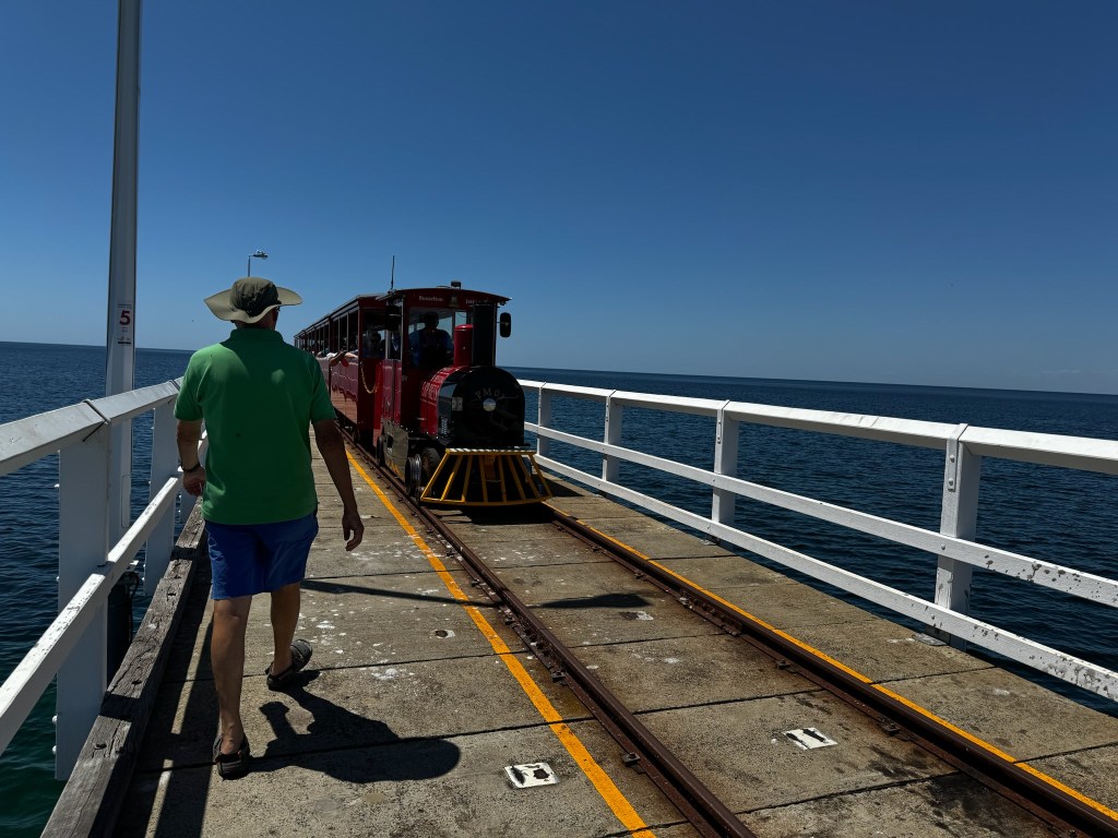 Ärgerlich: Heute Nachmittag wollten wir das Unterwassermuseum in Busselton besuchen, aber ausgerechnet an diesem einen der 730 möglichen Halbtage eines Jahres wurden Unterhaltsarbeiten ausgeführt und das Museum war deshalb geschlossen. Da hier am Wochenende ein Ironman Triathlon stattfindet und wir morgen bei Bekannten zum Essen eingeladen sind, haben wir keine zweite Gelegenheit. So haben wir uns damit begnügt, den knapp zwei Kilometer in Meer hinaus führenden Busselton Jetty, ein Steg, an dessen Ende das Unterwassermuseum liegt, abzulaufen.