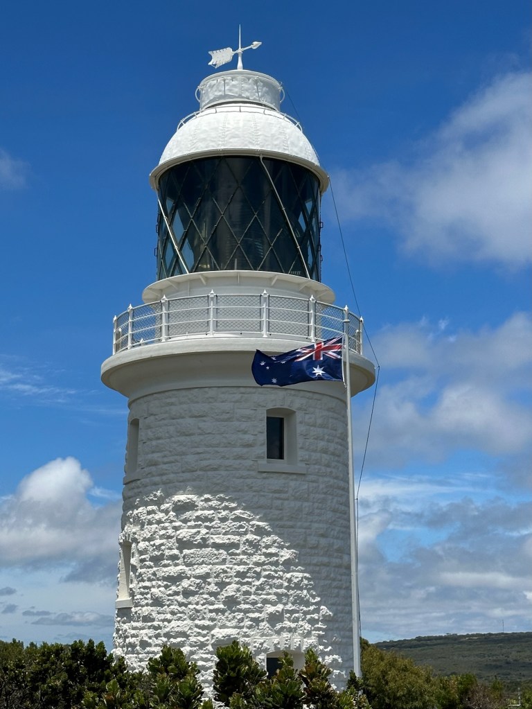Am Cape Leeuwin treffen sich der indische und der südliche Ozean. Diesen Punkt haben wir auf unserer heutigen Fahrt von Pemberton via Augusta nach Margaret River besucht. Am Cape haben wir eine Führung im Leuchtturm gebucht und eines der drei Wohnhäuser von Leuchtturmwächtern – heute ein Museum – besucht. Der Leuchturm, erbaut im Jahr 1895, ist immer noch in Betrieb, wobei heute der Betrieb vollautomatisch läuft. In den ersten Jahrzehnten waren drei Leuchtturmwächter für den Betrieb zuständig. Ein äusserst karges Leben, auch für die Familienangehörigen. So dauerte z.B. der Schulweg vom abgelegenen Cape zur Schule in Augusta mehrere Stunden. Im Museum konnte man viele persönliche Geschichten der dort wohnhaft Gewesenen lesen. Beispiel: Die Katze eines Leuchtturmwächters hat diesen stets nach oben begleitet. In einem Sturm wurde sie von der Plattform geblasen und fiel 32 Meter in die Tiefe, landete in einem Gebüsch und blieb unverletzt. Den Turm hat die Katze danach nie mehr betreten.