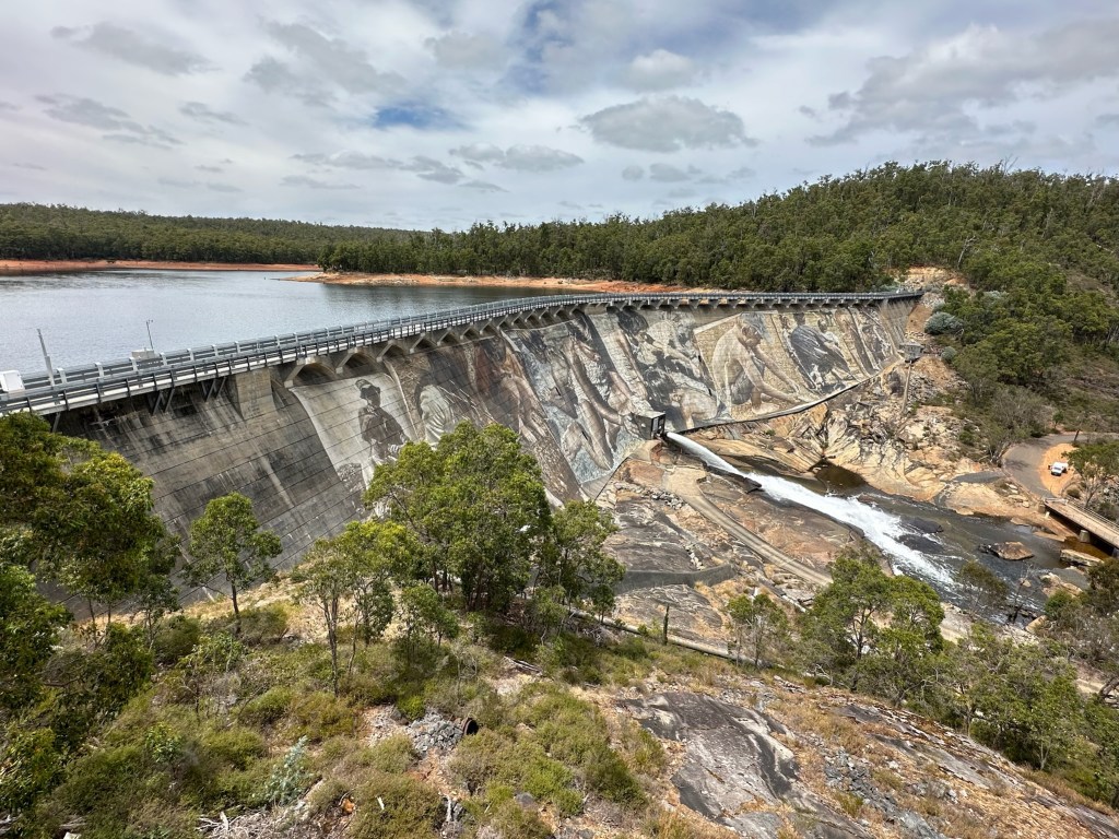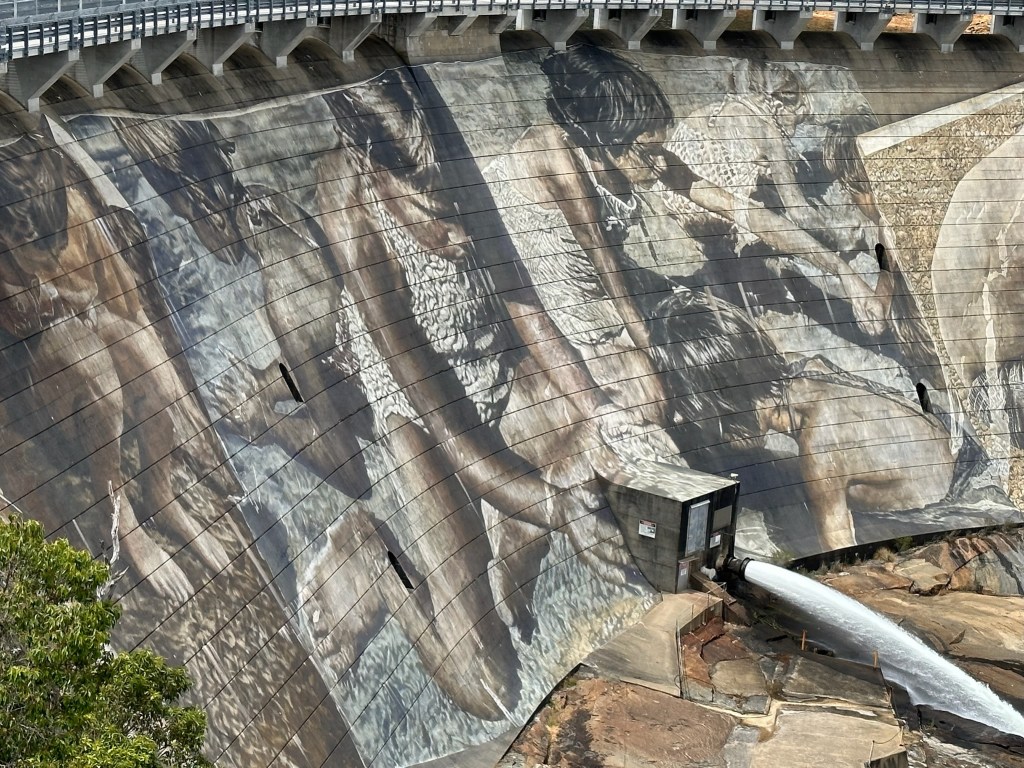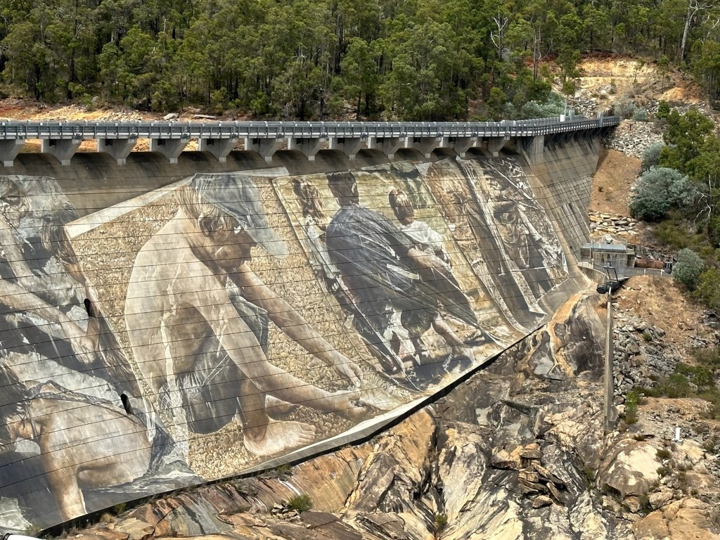 Unterwegs haben wir am Wellington Staudamm Halt gemacht. Dies weil die Staumauer mit einem weltgrössten Graffiti verziert ist. Das riesige Kunstwerk bedeckt eine Fläche von rund 8000 Quadratmeter.