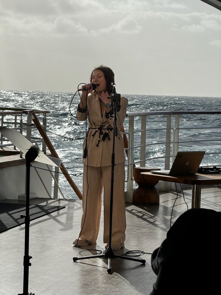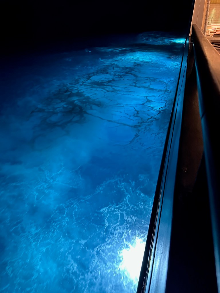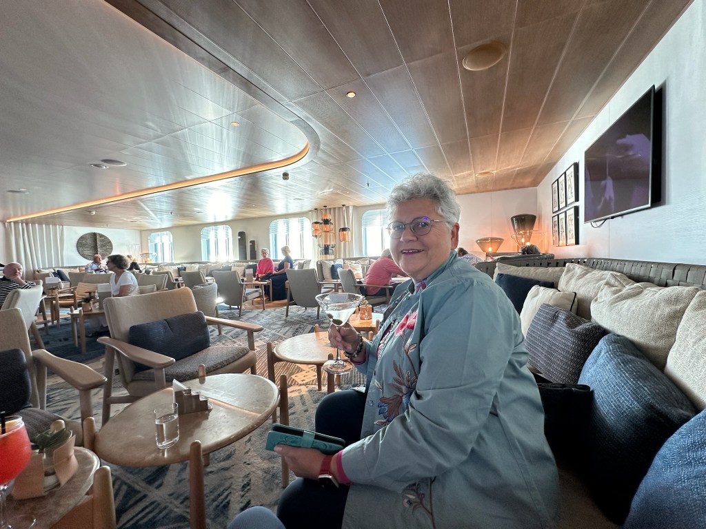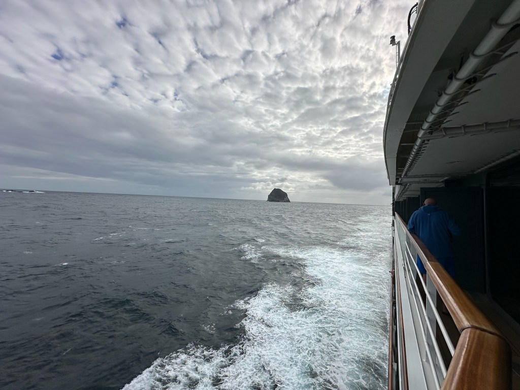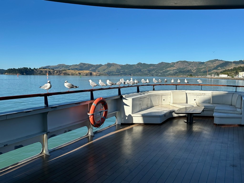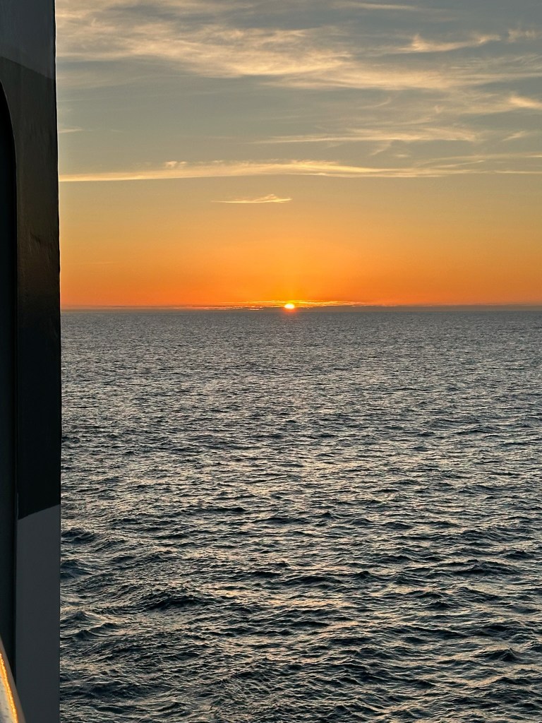 Le Lapérouse wird von Ponant, einer französischen Reederei, betrieben. Dementsprechend war das Essen sehr gut zubereitet, vielfältig und es hatte für jeden Geschmack etwas. Am Mittag und am Abend wurde zum Essen stets Wein gereicht. Wir sassen immer wieder mit andern Leuten am Tisch und man erfuhren so manch interessante Lebensgeschichte. In den Tagen auf See habe ich wohl das eine oder andere Kilo zugelegt. Nicht zu vergessen sind die drei Bars mit Bier, Wein, Cocktails und Schnäpsen – wir haben alle ausprobiert (gemeint sind natürlich die Bars 😇). Da jede Kabine einen kleinen Balkon hatte, konnte man das Schiff nur im Innern von vorn nach hinten durchlaufen, für ein Lauftraining etwas gar ungemütlich, dafür gab es ein Fitnesszentrum, einen kleinen Swimmingpool und für jene, die wollten, ein Unterhaltungsprogramm, Sauna und Massagen. Unterwegs sahen wir Delphine und einige Zwergwale. Erstaunt hat mich, dass Möwen auch mitten auf dem Meer das Schiff begleiteten.