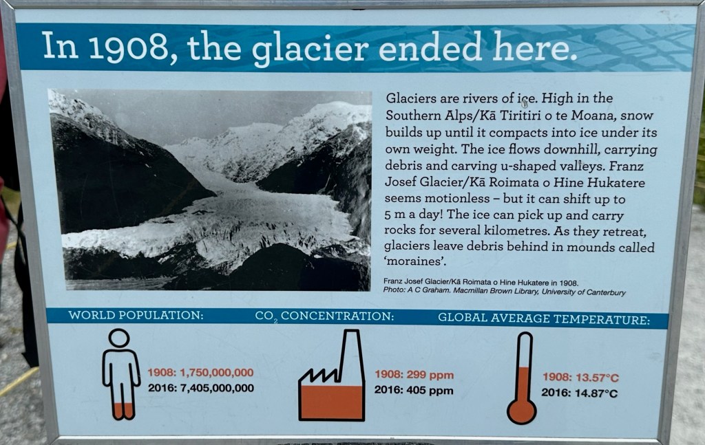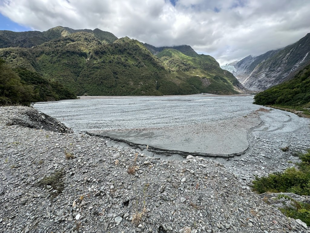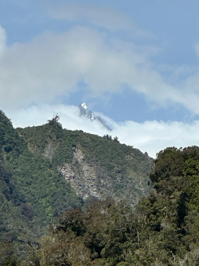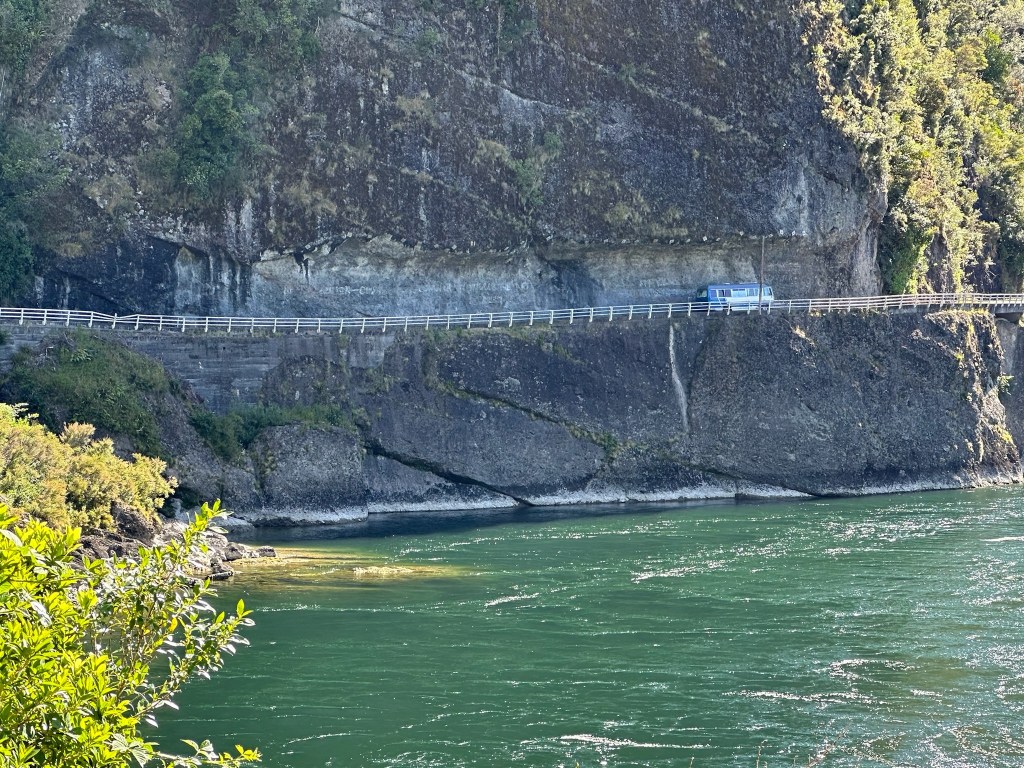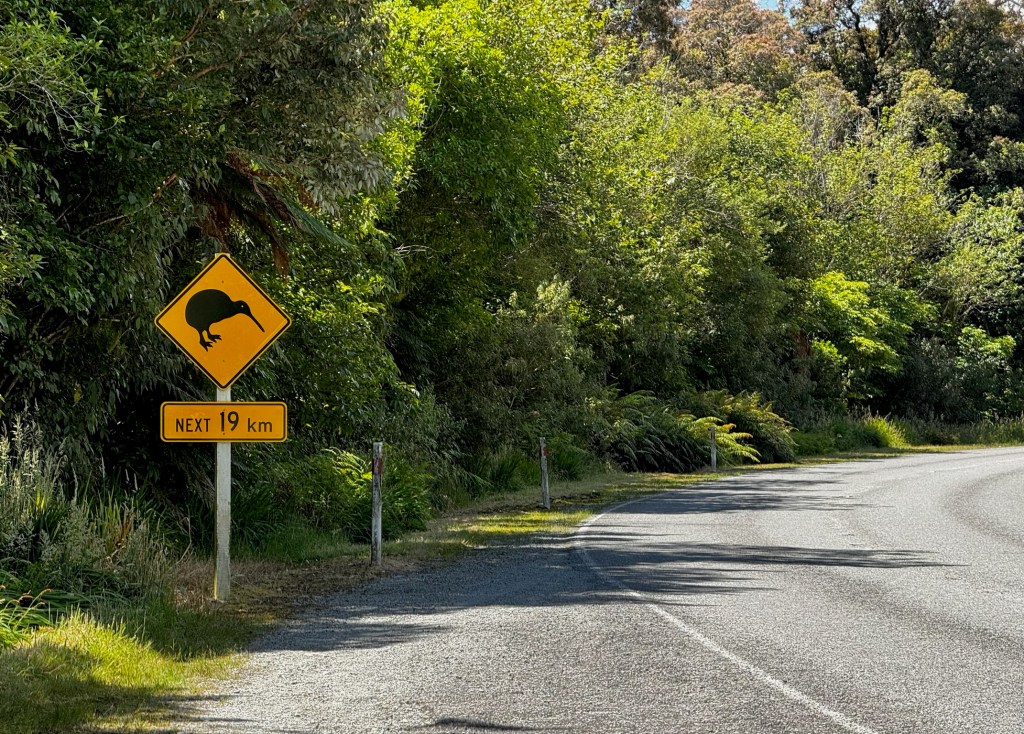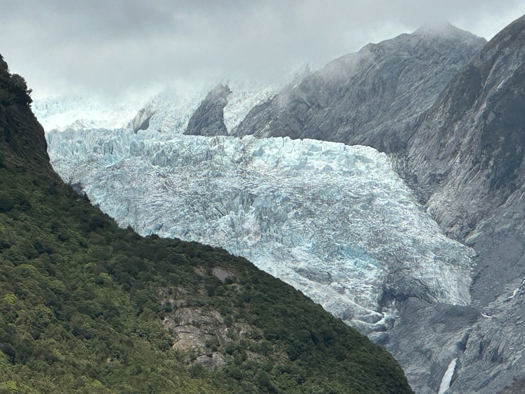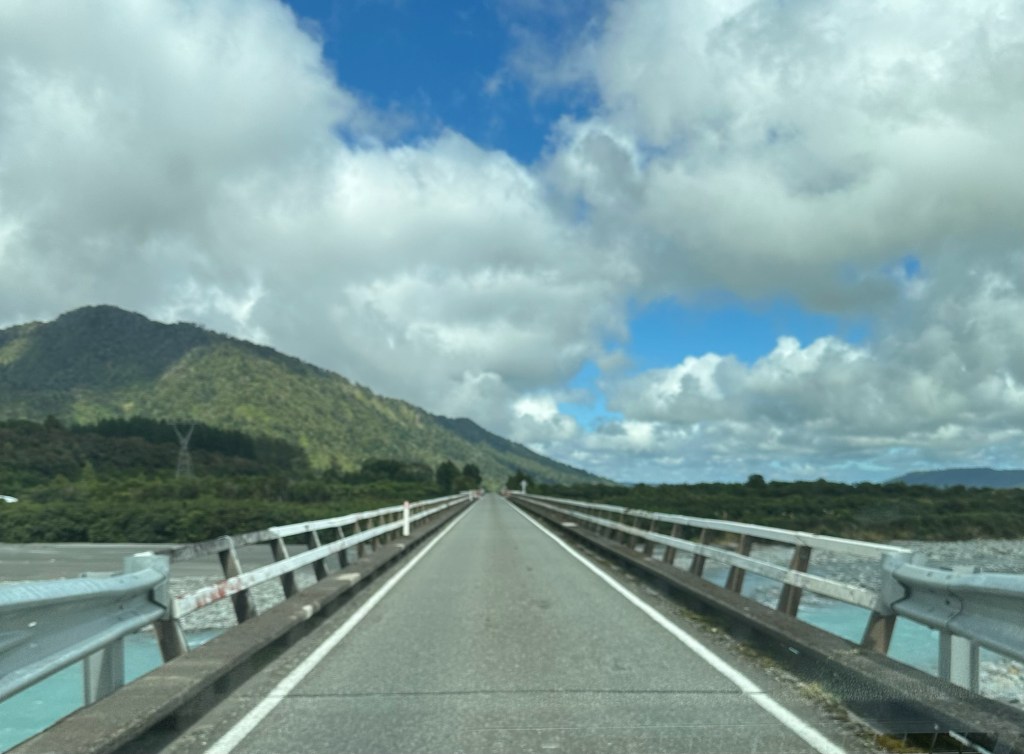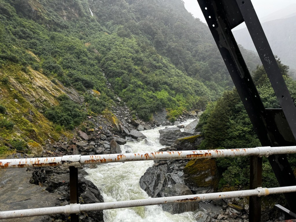 Von Hokitika aus sind wir der Westküste entlang bis Haast gefahren. Nebst diversen Fotostopps haben wir in Franz Josef Town Halt gemacht. Nach dem Mittagessen im kleinen Tourismusort unternahmen wir einen Spaziergang zu einer Aussichtsplattform, von der aus der Franz Josef Gletscher gerade noch sichtbar war. Diese Aussichtsplattform muss wohl bald versetzt werden, denn der Klimawandel trifft auch den grossartigen Franz Josef Gletscher – er hat sich bereits deutlich sichtbar zurück gezogen und er wird weiterhin viel von seinem Eispanzer verlieren. In Franz Josef Town echt störend waren die Helikopter, die in kurzen Abständen mit Touristen zu einem Rundflug über die Gletscherlandschaft starteten; fünf Flugunternehmen haben wir gezählt. Unseren Aufenthalt in Franz Josef Town haben wir daher kurz gehalten, ich habe sogar auf die Cremeschnitte verzichtet. Unterwegs mussten wir viele einspurige Brücken überqueren, zum Teil auch einspurige Hängebrücken. Lichtsignale für die Verkehrsregelung braucht es nicht – es gibt wenig Verkehr und bei den Brücken wird rücksichtsvoll gefahren und der Vortritt gelassen.