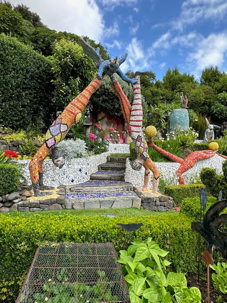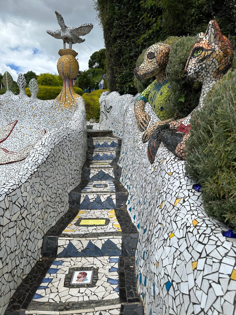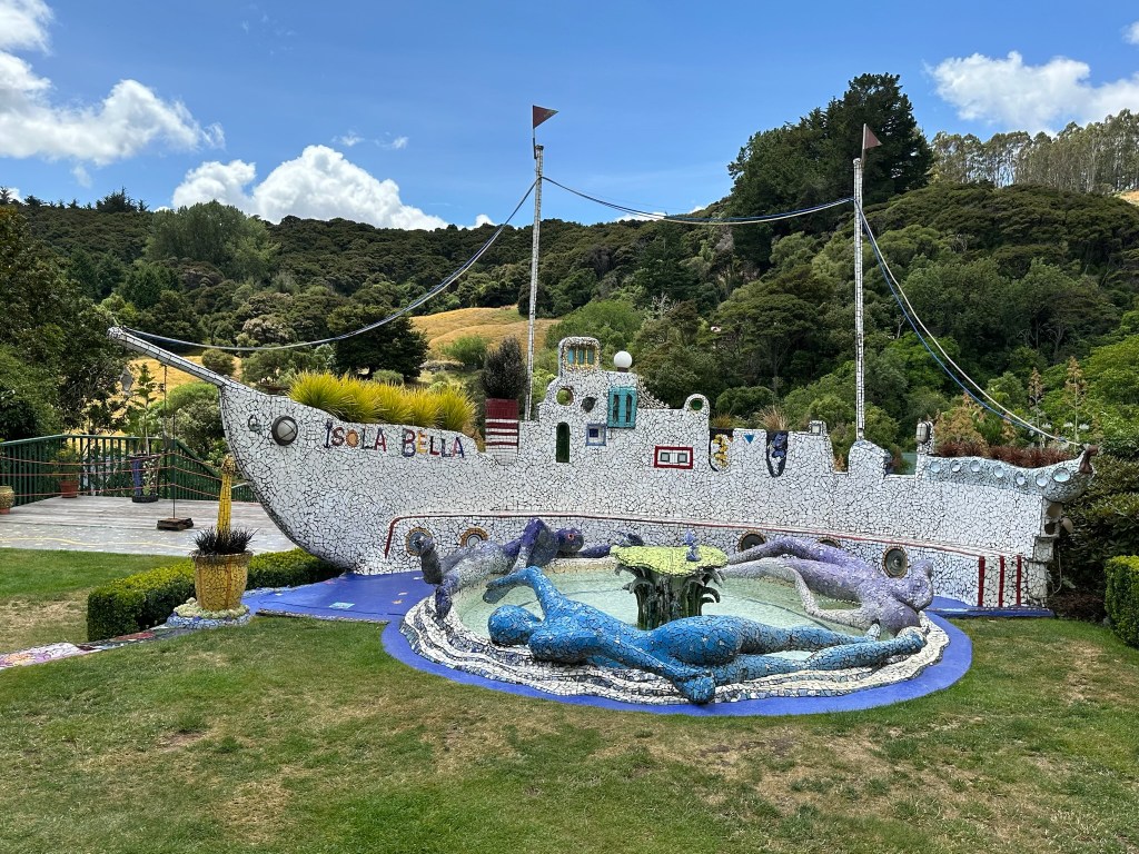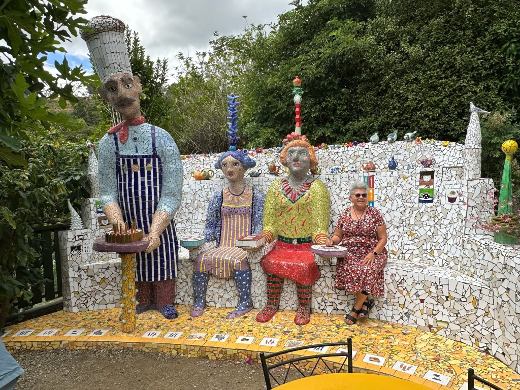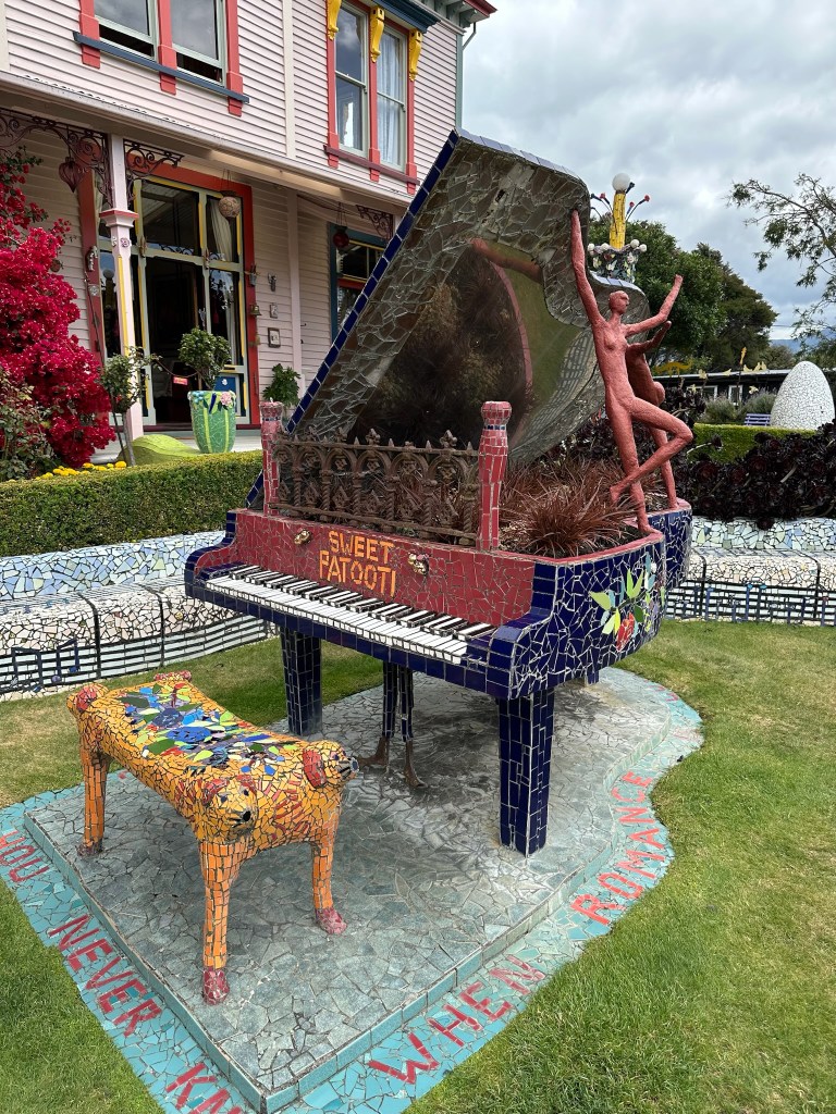 Temuka haben wir heute Vormittag verlassen und wir sind nun in Akaroa, rund 90 km von Christchurch entfernt. Die letzten 50 km auf der Fahrt nach Akaroa waren ausgesprochen kurvig, wir mussten mehrere Hügelzüge überqueren. Dafür wurden wir mit tollen Aussichten belohnt. Die grösste Belohnung aber wartete im „The Giants House„. Josie Martin, eine Künstlerin, hat vor 26 Jahren ein heruntergekommenes Haus aus dem Jahr 1880 gekauft. Als sie mit der Umgestaltung des Gartens begann fand sie viele Porzellanscherben von Geschirr (früher wurde der Abfall einfach im Garten verscharrt). Sie kam auf die Idee, die Scherben für Mosaikfiguren zu benutzen. Sie baut nun seit rund 25 Jahren – entstanden ist ein märchenhafter Garten mit riesigen phantasievollen Skulpturen. Ich lasse die Bilder für sich sprechen.
