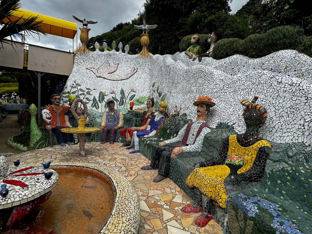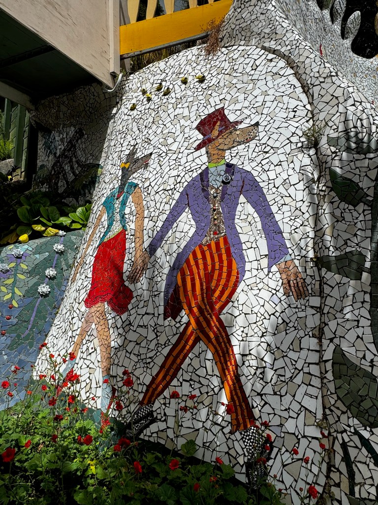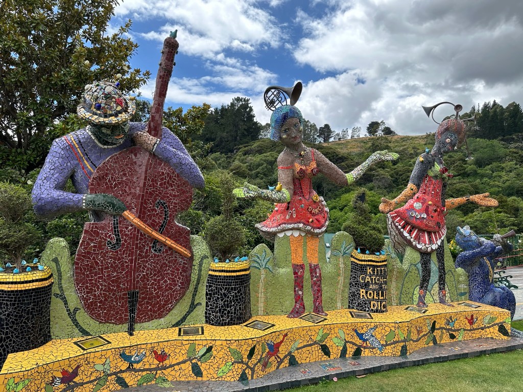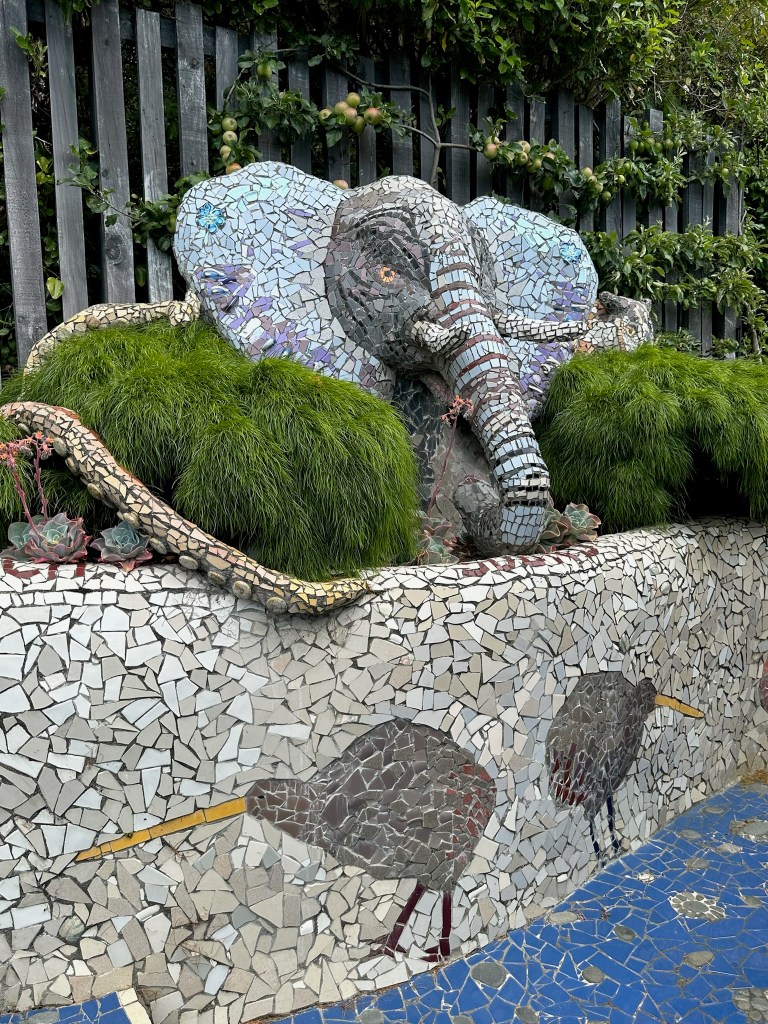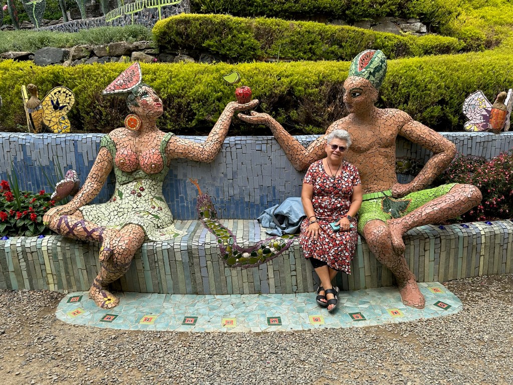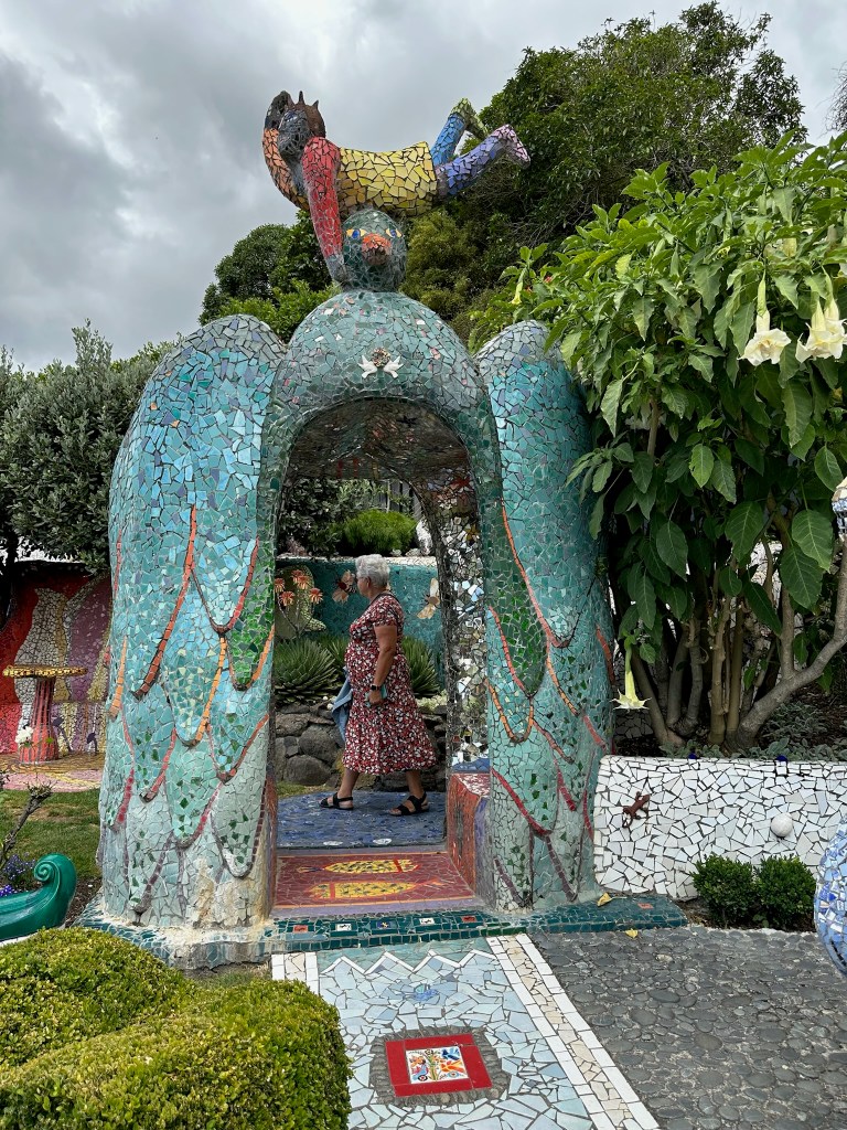 Temuka haben wir heute Vormittag verlassen und wir sind nun in Akaroa, rund 90 km von Christchurch entfernt. Die letzten 50 km auf der Fahrt nach Akaroa waren ausgesprochen kurvig, wir mussten mehrere Hügelzüge überqueren. Dafür wurden wir mit tollen Aussichten belohnt. Die grösste Belohnung aber wartete im „The Giants House„. Josie Martin, eine Künstlerin, hat vor 26 Jahren ein heruntergekommenes Haus aus dem Jahr 1880 gekauft. Als sie mit der Umgestaltung des Gartens begann fand sie viele Porzellanscherben von Geschirr (früher wurde der Abfall einfach im Garten verscharrt). Sie kam auf die Idee, die Scherben für Mosaikfiguren zu benutzen. Sie baut nun seit rund 25 Jahren – entstanden ist ein märchenhafter Garten mit riesigen phantasievollen Skulpturen. Ich lasse die Bilder für sich sprechen.