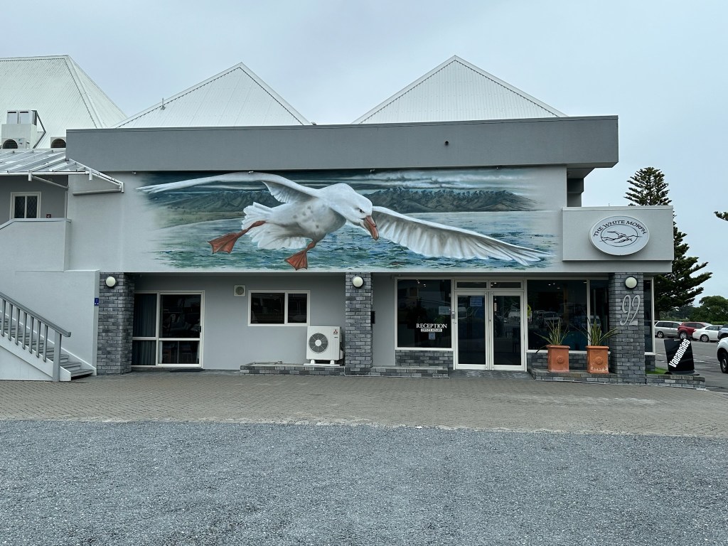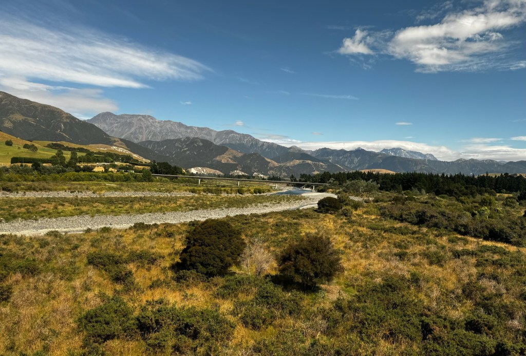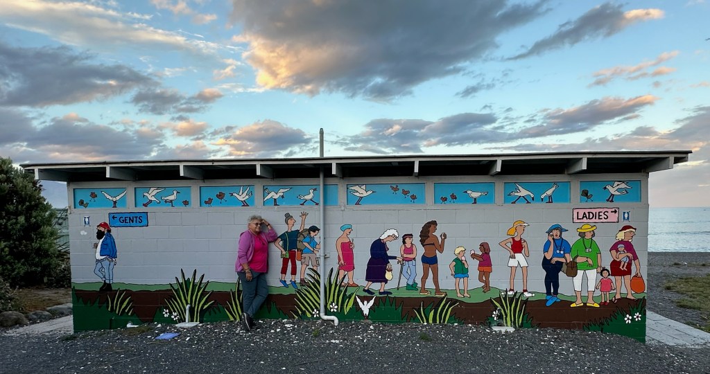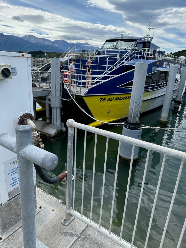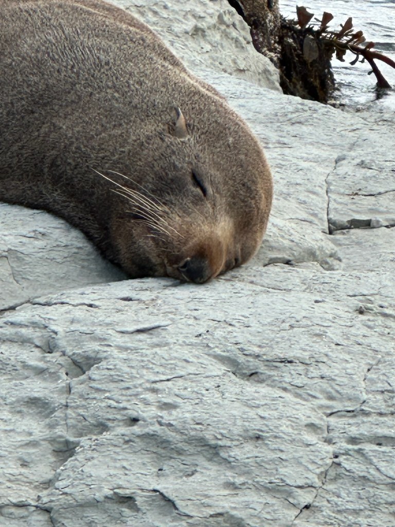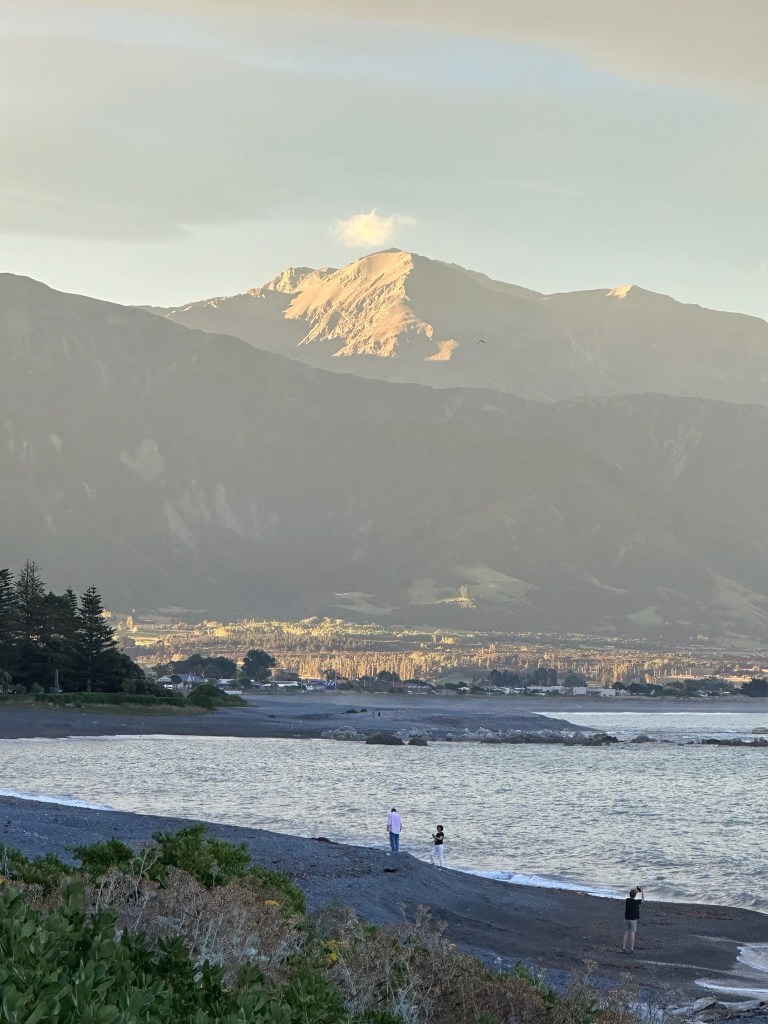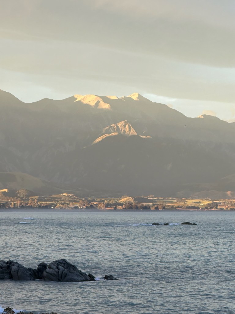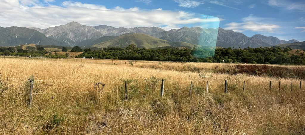 Heute hiess es früh aufstehen. Um 5 Uhr morgens weckte uns der Wecker, um 6 wurden wir abgeholt. Am Bahnhof angekommen gaben wir unsere Koffer ab und dann hiess es warten bis der Zug um 7 Uhr abfahrtbereit war. Die Coastal Pacific von Christchurch nach Picton entlang der Ostküste der Südinsel ist eine der weltweit schönsten Bahnstrecken. Wir absolvierten heute nur die Hälfte bis Kaikoura, der Rest der Fahrt ist für Sonntag vorgesehen. In Kaikoura angekommen, es war 17 Grad kalt und es regnete, Berge im Nebel unsichtbar (Kabamba!, wir hätten doch Hochsommer), buchten wir als Erstes eine Walbeobachtungsfahrt für den Freitag. Unser Hotel, 1.5 km vom Zentrum entfernt, hatte unser Zimmer bereit, sodass wir unser Gepäck loswurden. Wir erkundeten den Ort und schon etwas müde vom Herumlaufen mussten wir noch einkaufen. Ich fragte eine zufällig im Garten stehende Frau nach dem Weg. Sie erklärte uns, dass wir noch ziemlich weit laufen müssten. Dank meinem Charme 😇 schlug sie vor, uns zu fahren. Sie holte extra den Wagen aus der Garage, fuhr uns zum Laden, wartete bis wir eingekauft hatten und brachte uns dann zum Hotel. Da soll noch jemand sagen, die Neuseeländer seien nicht hilfsbereit.