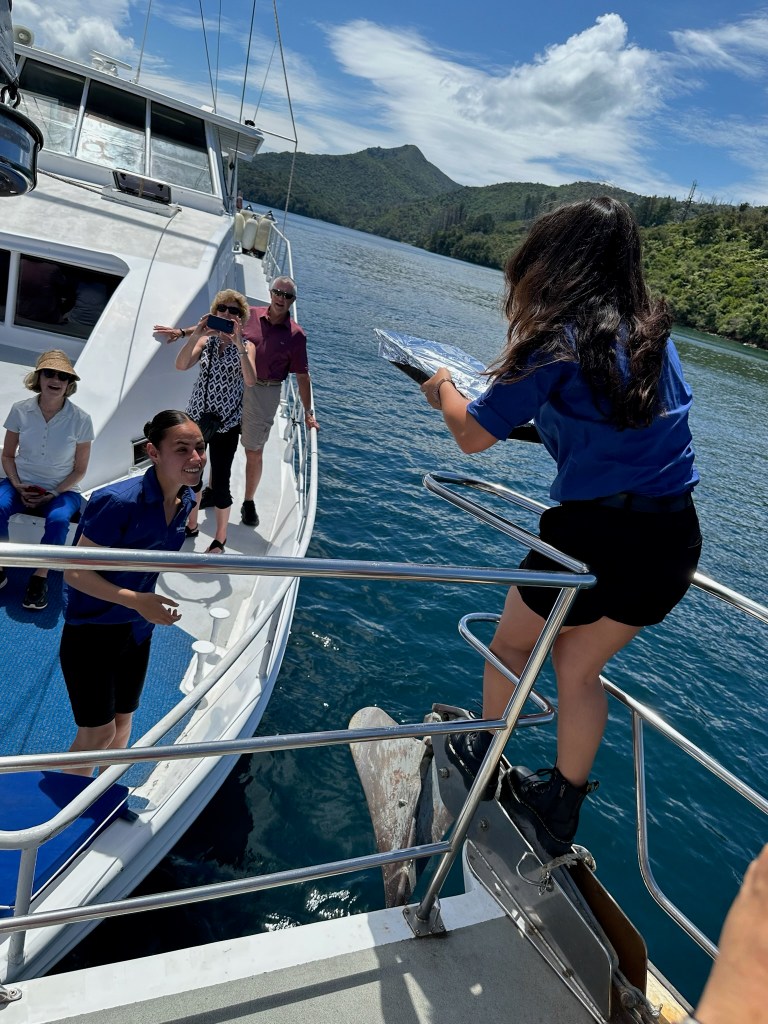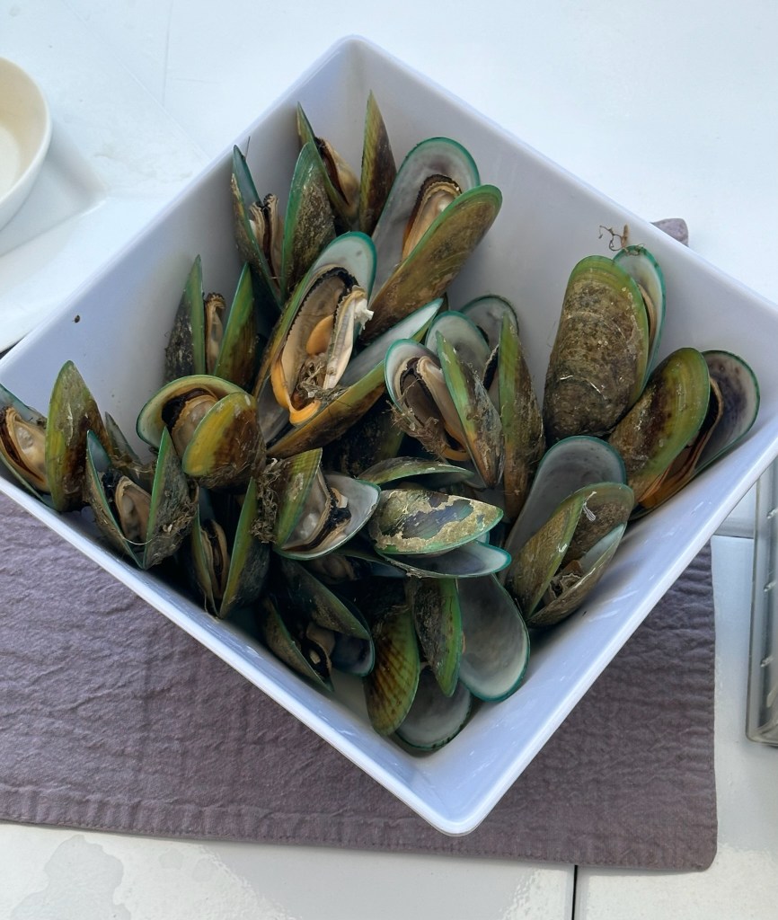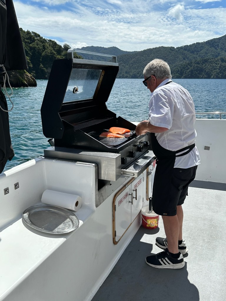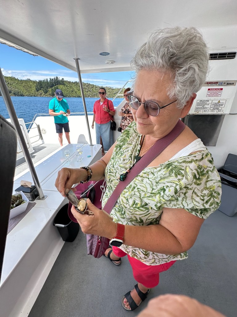 Nach einem gemütlichen Vormittag haben wir für heute Nachmittag die Marlborough Sounds Seafood Cruise gebucht. Carole hat sich sehr darauf gefreut – ich als Landei habe mir Gedanken gemacht, was für grosse und kleine Meeresungeheuer ich wohl essen muss. Pünktlich um halb zwei ging’s los und Petrus hat entgegen den Prognosen sogar die Sonne scheinen lassen. Die Marlborough Sounds erinnern stark an den Vierwaldstättersee, gefehlt haben eigentlich nur die hohen schneebedeckten Berge. Zum Essen gab es zuerst absolut frische Greenlip Mussels; unser Schiff hat unterwegs ein anderes getroffen, von welchem diese Spezialität frisch aus dem Wasser zu unserem Schiff herübergereicht wurde. Diese wurden dann gekocht und wir konnten danach à discretion essen. Ich hab wohl mehr Muscheln verdrückt als in meinem ganzen bisherigen Leben (was nicht heisst, dass ich gehamstert hätte, sondern ich habe mich bei Muscheln aus dem Meer bisher stets vornehm zurückgehalten). Später hielt unser Kapitän das Schiff an, legte es vor Anker und grillierte frischen Lachs – supergut, nur leider zu wenig. Das wars auch schon. Das Essen von Krabben, Kraken und was sonst noch an komischen Viechern im Meer zu finden ist, blieb mir somit erspart. Zurück an Land habe ich dann, ganz der Rheintaler, eine Kürbissuppe mit Knoblibrot gegessen.