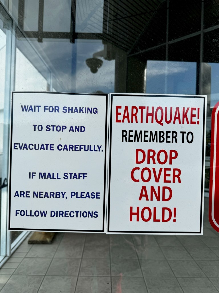 Noch eine Bemerkung zu den Erdbeben: Im Einkaufszentrum neben unserem Hotel haben wir eine kurze Anleitung zum Verhalten im Fall eines Erdbebens gesehen (siehe Foto). Grund ist, dass in Neuseeland die Erde sehr oft bebt. So gab es am Samstag in unserer Nähe ein Beben mit der Stärke 4.7. Du kannst hier nachschauen wie oft es in Neuseeland bebt.